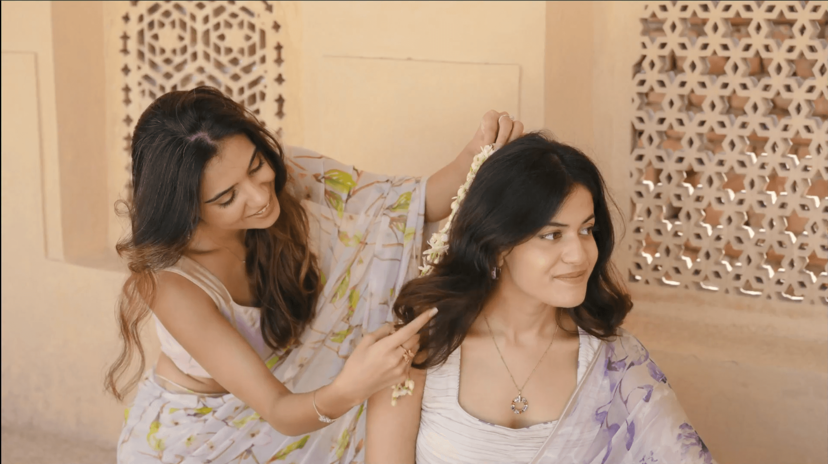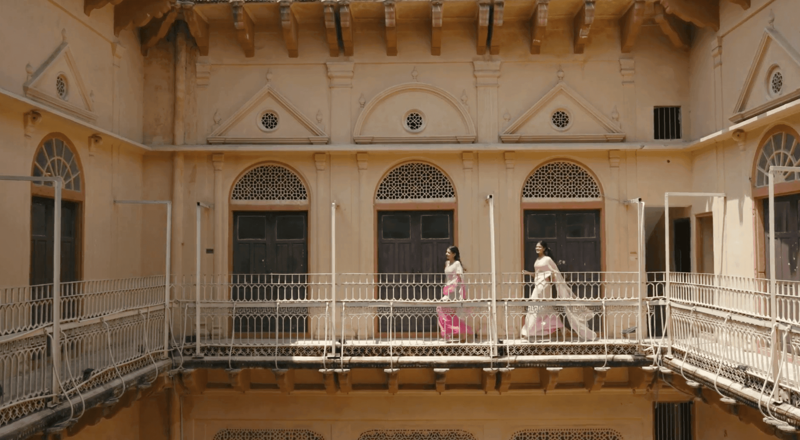 This 30-45 second reel video celebrates the enduring bond of sisterhood on a monsoon-washed haveli terrace, filled with vibrant Zari chiffon sarees and the gentle melody of a harmonium.